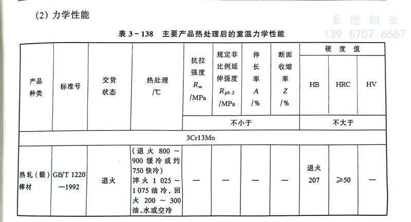主要性能與3Cr13不銹鋼相同。但因含有0.50%~1.00%鉬,可提高鋼的耐蝕性,其耐蝕性比3Cr13不銹鋼和4Cr13不(bu)銹鋼(gang)好。3Cr13Mo不銹鋼經淬火并回火熱處理后,在腐蝕介質中具有承受高機械載荷能力和耐磨性能。但可焊性能差。