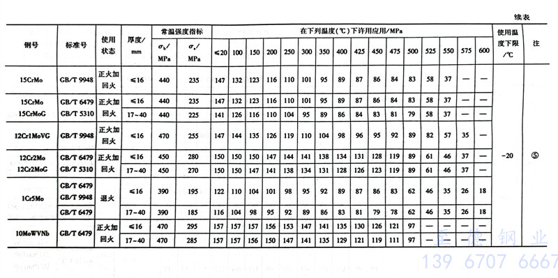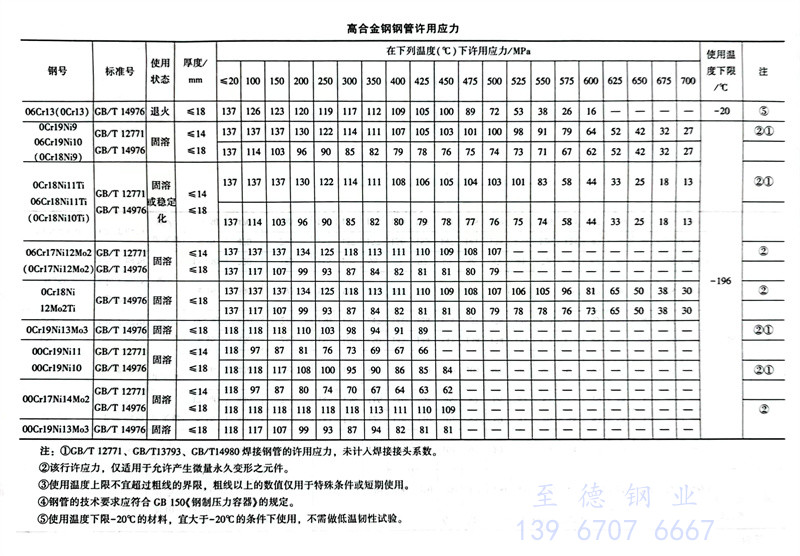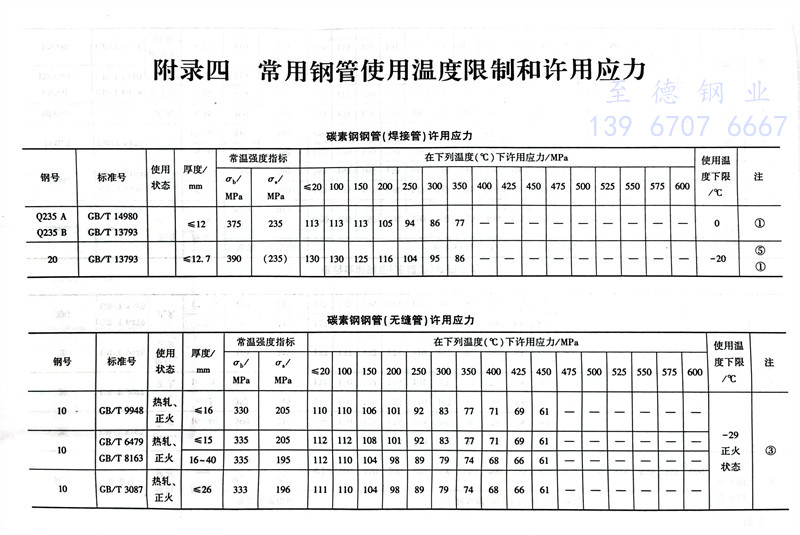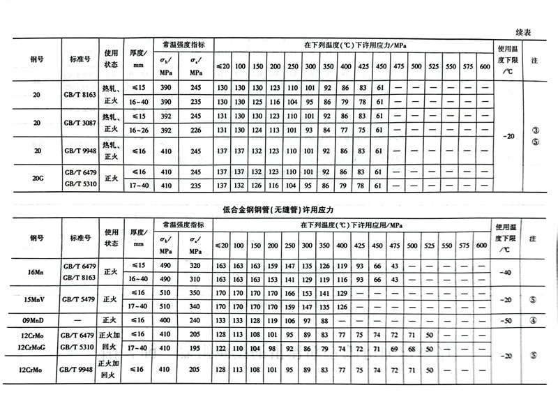 常用鋼管使(shi)用溫度限(xian)制和許用應力參(can)照表(biao)