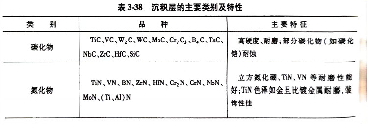 氣相(xiang)沉(chen)積(ji)按形(xing)(xing)成(cheng)的(de)(de)(de)基本原理(li),分(fen)為化(hua)學氣相(xiang)沉(chen)積(ji)(CVD)和物理(li)氣相(xiang)沉(chen)積(ji)(PVD)。氣相(xiang)沉(chen)積(ji)是(shi)在(zai)工(gong)件(jian)表面覆蓋一(yi)層厚度為0.5~10μm的(de)(de)(de)過渡族元素(Ti、V、Cr、W、Nb等(deng))與C、N、O、B等(deng)形(xing)(xing)成(cheng)的(de)(de)(de)化(hua)合物,或單(dan)一(yi)的(de)(de)(de)金(jin)(jin)屬及非金(jin)(jin)屬涂(tu)層,使(shi)零(ling)件(jian)表層改變化(hua)學成(cheng)分(fen),并(bing)在(zai)其表面形(xing)(xing)成(cheng)功能性(xing)(例如(ru)超硬(ying)耐磨層)或裝飾性(xing)的(de)(de)(de)化(hua)合物涂(tu)層的(de)(de)(de)新技術,現已廣泛應用于各(ge)類(lei)零(ling)件(jian)的(de)(de)(de)硬(ying)化(hua)處(chu)理(li)。沉(chen)積(ji)層的(de)(de)(de)主要類(lei)別及特性(xing)見表3-38。